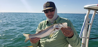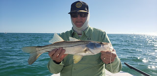 Guess who was back on board today? Yes, Jerry! This time Maggie couldn't join us but off we went lamenting her trip back to the ice and snow. I've been wanting Jerry to catch snook and we missed on the last trip but today was another opportunity to accomplish that goal. I took him to the "snook spot" and after a few misc fish he landed his first snook and later upgraded on the size using jig and shrimp. Way to go Jerry! We wrapped up the trip with catching dinner so he could use his fillet knife again.