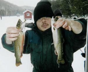 This lake is stocked with brook and rainbow trout once a week, so catching tasty shore lunch is almost guaranteed. The morning started off quite slowly, with no hits for the first couple hours or so. They were stocking on that day, but unfortunately, due to the number of fishermen on the lake, they skipped our holes / cabin. Pity, it would have been very interesting for the children to watch about 150 trout being dropped next to our 15 lines.