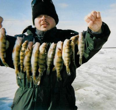 We set up 5 rods with bells and 10 tip ups, with a variety of rigs. The the shallower outer holes brought in most of the fish, the water was about 12' deep. We caught a dozen perch in the 6" to 8" range, and lost a few more trying to teach the kids how to get a good hookset when ice fishing. They had a great time, all I forgot was the sunscreen, we ended up with mild sunburn.