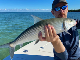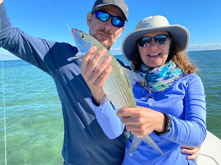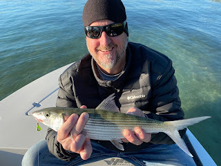Two more trips today and my morning trip was with Michelle and Jack. The goal was to bonefish and then go catch anything else but boy was I concerned as the morning temps were in the low 50's and the water temps had dropped 3-5 degrees. Spot one for bonefish was dead but spot two paid of with Jack getting his first bonefish. The rest of the trip was downhill as the fishing never did recover and all I could produce for Michelle were two jacks. This was tough and I was not looking forward to fishing my afternoon clients at this point. But I remembered yesterday and how the fishing improved in the afternoon so all hope was not lost.
