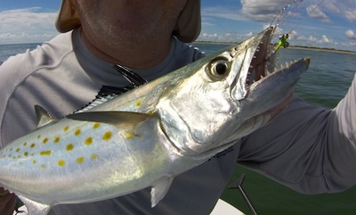 The Spanish macks were nice ones, and there were jacks and bluefish too. I broke out the fly rod while George threw jigs. We went through lots of baits, but it was pretty much a fish every cast. Both bluefish and Spanish mackerel are entirely capable of severing 40 pound fluorocarbon leader. They did just that repeatedly. Lure manufacturers must love those species!
