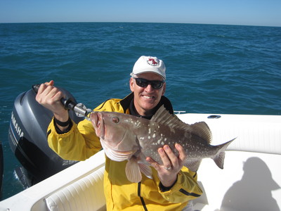 Monday morning, 12/5, winds blew pretty hard and it was choppy heading out to twenty miles west of New Pass. But my long-time customers and hardy anglers, Mike Connealy and his son, Clint, didn't mind a little chop. They used squid to catch sixteen red grouper, including a keeper at 23 inches, along with thirty grunts to 14 inches, of which they kept six, and five porgies to 13 inches, of which they kept two. They also caught a 13-inch margate.