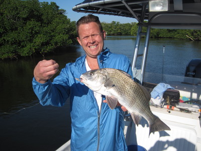 Friday morning, 12/9, another windy one, I fished a catch-and-release trip with Joe Hahn in south Estero Bay, where we released a total of thirty-two fish, including lots of sheepshead, three spade fish, a brace of 18-inch black drum, a mangrove snapper, a 13-inch mutton snapper, a few pufferfish, and a couple of ladyfish. Everything bit on live shrimp.
