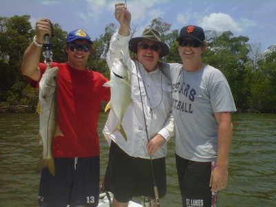 George his son phil and friend with a river double.Brian Black caught this 6ft. hammerhead while tarpon fishing off Ft. Myers beach. Tarpon ,sharks and mackerel are all over the beaches with a lot of the tarpon heading more north. Phil Samenuck with a San Carlos Bay snook.