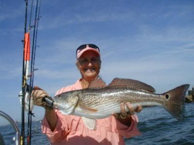Redfish are at the jetties, along the edges of the ICW, and in the creeks. Irritate one with a big noisy topwater plug and he might smash it. Speckled trout will hit topwaters also. I caught two on top today, along with a real surprise, a big sail catfish! I thought I had a big trout, but got slimed instead.