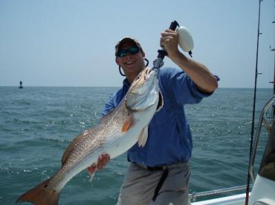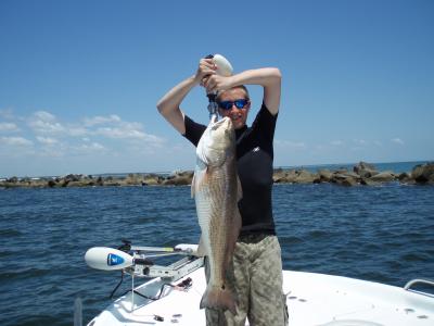 Some nice size reds are schooling at the jetties. We've caught them up to 17lbs so far. The tarpon have shown up also, and are a real surprise when the redfish you were expecting turns into an airborne tarpon. Most of these jetty tarpon seem to be in the 15 to 50 lb range. A customer caught a 20-30lb tarpon Wed on a greenie(threadfin herring) at the north jetty. It's not unusual for one of them to hit a live shrimp on a float rig. The larger tarpon will be hanging around pogie pods along the beach, or behind shrimp boats.