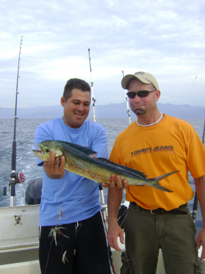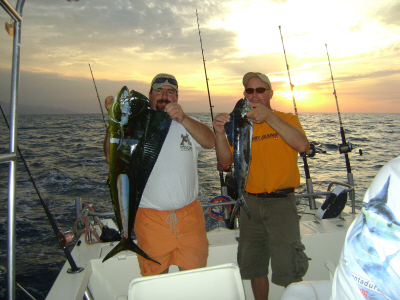 Now if you're thinking of a short duration trip, then a four hour shot in the bay towards Punta Mita is like Magic. If you check out the picture of the guys with the sunset in the back ground, you'll see what I mean. If you can blow up the photo, you'll see the "bill whap" I talked about earlier. The contrast of the guy's shirt behind the Mahi Mahi will show what I'm talking about.