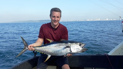 Winter is here and our game fishing season ended abruptly at Easter after the floods. Clean up teams came out in full force about a week after the floods and the bulk of the debris has been cleaned up. Offshore waters are clearing up and things are looking alive and active. The water temperatures have been dropping and today it averaged just over 22 deg.C. Deeper out the water is clear blue and inshore it is green but clear. This morning as we left port we saw the first Whale for the season and there are many juvenile Gannets around. We had a short morning trip with a guest from the US who said he wanted a Yellowfin Tuna and had tried in many places around the world but always lucked out. I found nothing in the deep so headed inshore with light tackle and different tactics, we found some bird activity but they were only smashing sprats and no fish. I then found and area with good showings and 1 bigger fish and started working that spot that I marked and we had a good run with Bonito (Eastern Little Tuna), catching one after another and even plenty multiple hook ups which was great fun as our sole guest got to fight fish after fish after fish and on light tackle Bonito are good sport. During all this action we had a large Zambezi Shark (Bull Shark) about 3.5m long jump clear over our lines just a few meters behind the boat, this was a magnificent display when he broached about 3m in the air and twisted as he cam e back down. I could still see 1 big fish on the showing in the shoal as we followed it around and finally after landing 20 Bonito we hooked into a good size Yellowfin Tuna which gave a great fight on the lighter tackle. I knew the Tuna was there, I saw him and we persisted till we got him. After landing the Tuna we got a few more Bonito and then we headed back to port.