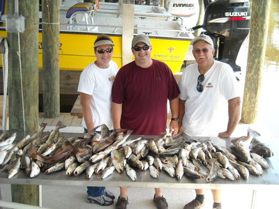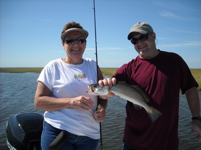 Trey Jackson set up this trip for his mom Brenda and his dad Gene. Things started off kind of slow the first few spots only a couple. We found a few trout in Lake Amadee but they would not stay on. So I made a big move toward the outside and started picking up some nice trout working the points along with a few reds but still slow and no tide moving. It was looking like a build a box day one at time. Made another run further out to the edges near Black bay which proved to be the right move. The tide was starting to come in and we got on a school of trout on the first drift down the shore. Power pole down and it was a speckled trout on just about every cast with live shrimp and plastics under a cork. It did not take too long and the limit and the box was full. AWESOME catch on a tough day with no tide. We called it a day and headed in to clean up the fish around 1:00 PM