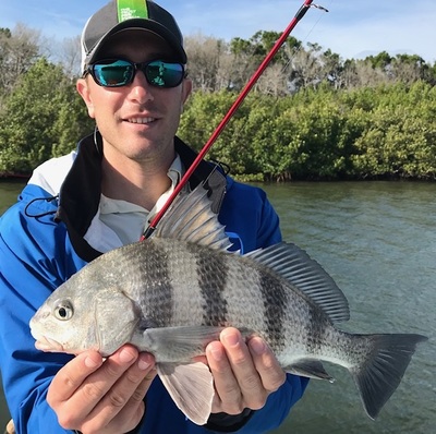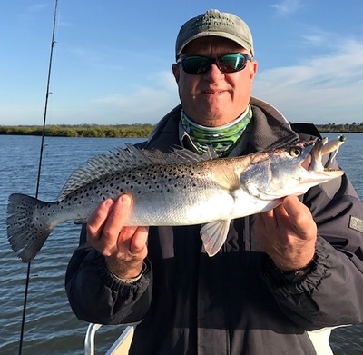 It has been a “Florida winter” so far as of early 2019, plenty of chilly nights in the 40’s with a few down to the upper 30’s, throw in several days from 75’ to 80’ and it’s a nice cool to mild winter pattern. Water temperatures have ranged from mid 50’s after the chilly spells and up to the mid 60’s after a few warmer days. Clear water is the normal in winter, more clear when cold, cloudy up just a little with warmer temps, schooling fish is the winter pattern, Seatrout schools are common along the drop offs and sloughs in the backcountry and lagoon, a paddle tail jig or live shrimp are a sure thing hook up on the schooling trout. Find the right spot in winter and the fish are bunched up together, not unusual to catch Trout, Reds, and Snook in the same spot, Black Drum and Sheepshead can be there too. On a sunny day schooling Redfish go shallow for a little sun warmed water, slow and stealthy is the way to get close enough for a cast to reach them with a live shrimp or small soft plastic lure, Seatrout can be right in there with the Reds on a winter flat, here I am with a nice winter Seatrout off a 2 feet deep flat with an artificial lure……………………