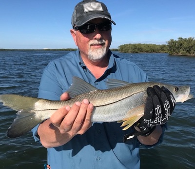 Our Snook population has been coming back again after a winter freeze a year ago which lowered the local numbers with some Snook not able to survive very cold water temps, we are regularly catching a few on most trips into the backwaters, Bob from Orlando with a fun size linesider from a recent trip………………….