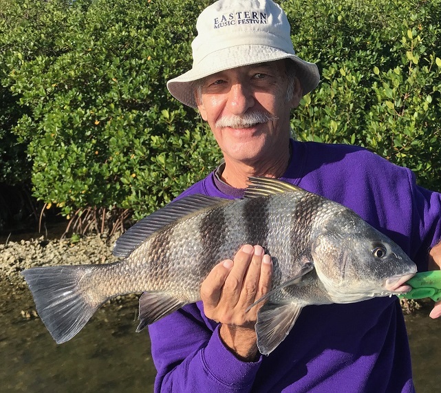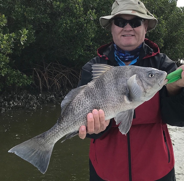 Winter has set in with the first cold snap of the season in East Central Florida, frost on my yard is a sure sign, water temperatures reaching down into the 50’s begins the true winter pattern. Fish be come less scattered and more concentrated, some in the deeper holes and channels, some on the flats when the sun shines and warms the shallow water. Searching skinny water for Redfish and Seatrout is a winter favorite here at Mosquito Lagoon, the holes, sloughs and channels can hold Black drum, Sheepshead, Whiting, and more. If it doesn’t get too cold, the Snook will continue to feed also on drop offs and close to structure in the back country. Clearer water means lighter stealthy rigs to hide it from the target fish. A few days ago Jeff from Kentucky out with me on a nice size Black Drum caught off the bottom of a deep cold water hole …………….