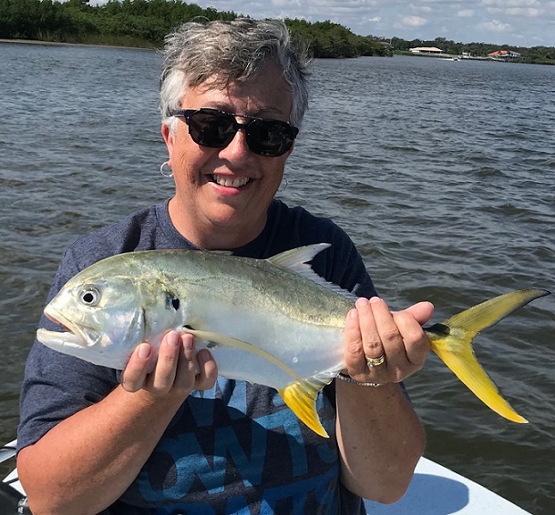 Long time regular client Bonnie from Iowa always seem to catch a photo fish or 2 on their annual trip, a fun fighting size Jack Crevalle in this pic ………….