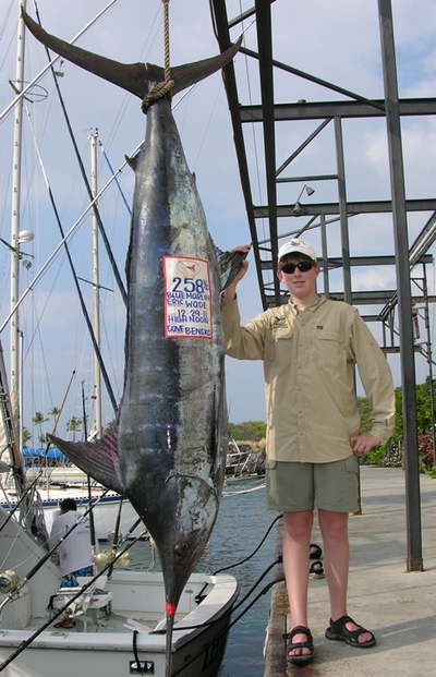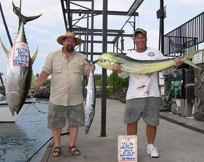 January (year after year)has always been a pretty good fishing for the bigger Blue Marlin. Also, this January has been excellent for Spearfish and Mahi Mahi, plus the humpback whales are beginning to show up. If you are looking for flat water, great scenery, humpback whales and a chance a a giant Blue Marlin, there is no better place in the world than Kona, Hawaii in January. Both photo are fish landed this January.
