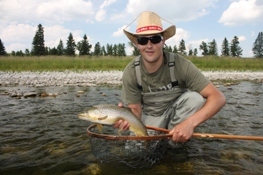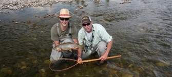 Justin and his father Shane joined us for a float trip down the bow today. We floated from policeman's flats to Mackinnon flats again. Justin has been going to school in Montana so he has been fishing a bunch of Montana fisheries so we had to show him how the bow compares to his Montana fishery. Justin's first fish to start the day was one of the best trout he had ever seen in his life. It was simply another beautiful 19 inch average bow river rainbow. So Justin was impressed right from the get go. The fishing just kinda stayed steady from there. Justin and his father were into fish throughout the day. Before lunch both Justin and his father had a double header with two big browns on. Shane lost his but Justin was able to land his and it was a football of a brown that was a gorgeous fish that absolutely rattled Justin's cage after being used to some of the fish he'd caught in Montana. He was pretty impressed to see just what type of quality we have in the bow here. Justin was yelling and screaming loud enough that all his buddies down in Montana probably heard him when he hooked this fish and it took to the air the first time. It was a pretty entertaining fish. The rest of the day was much of the same the fishing slowed down a little bit in the afternoon with the heat we were having but as it approached the evening we started fishing hopper droppers and took several fish that way too. Once again we pulled into the boat launch with a fish hooked up so it's a pretty nice way to end the day when you can start the day and you've got a fish already when you still see boat launch at the put in and you've got a fish on when you pull into the boat launch for take out. Another pretty remarkable day on the bow.