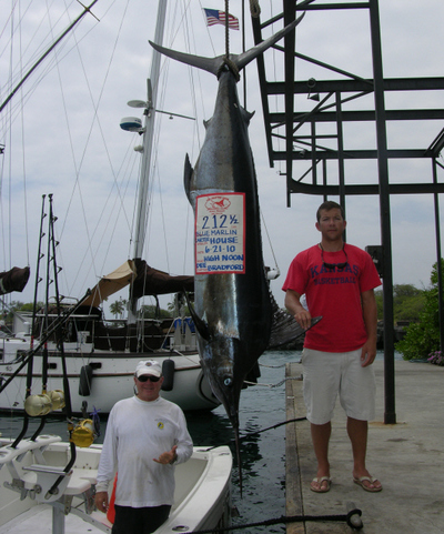 On another recent charter, AJ Fiore from Centreville, Virgina relived his fathers experience from 25 years ago. Vicki Fiore chartered HighNoon for her sons. AJ's Dad had caught a marlin in Hawaii 25 years ago and Vicki wanted her son's to have that same experience. Vicki and her sons were on a cruise ship and were only in port for the day. We hooked up a nice 200 lb Blue about 2 pm...and AJ got it to the boat in about 20 minutes where we release it. The day before, was a fun day for Jeff Linquist and Jack Phenix from Lincoln, Nebraska. Jeff really wanted a blue marlin and we thought we had one when the short corner lure went off. With the line screaming out from the reel, Jeff got in the fight chair and began to fight the fish. When it went deep and didn't jump, I began to suspect it wasn't a marlin. About 20 minutes later, we brought up a 137 lb. Ahi (giant yellowfin tuna). Normally an Ahi would bite our smaller lures further from the boat. This one hit the biggest lure that was the closest lure to the boat. That's fishing!