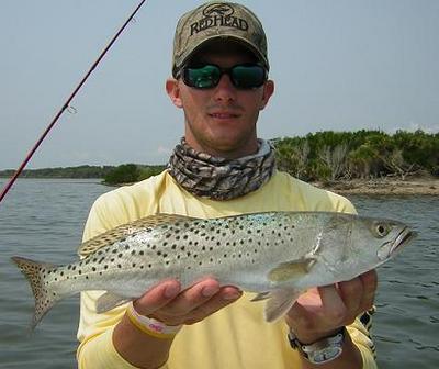 Water levels have finally started to rise here on Mosquito Lagoon as our long awaited summer rainy season has arrived with regular afternoon rains. Most mornings have beautiful calm conditions with a little coolness in the air for the first couple of hours after the rain the evening before. The higher water on the flats will open up much more fishable water for me as grassy shallows which have only had a few inches of water over them the last few months now are deep enough for the Redfish and also us in my boat to be on the prowl hunting our prey. Also these newly flooded areas are flush with Redfish food because they have been to shallow for the fish to graze on for so long now allowing for many baby crabs, shrimp, and marine invertebrates to grow un harvested by the Reds. The last couple of weeks since my last report have seen many good trips with Reds on the flats by targeting the large mullet schools which gather in shallow water to avoid the Dolphins and larger predators of deeper water. Also when available, fishing live Pigfish baits for Seatrout on the drop offs, edges, and holes. My Indian River Backcountry mixed bag trips have been loads of fun with lots of action from Trout, Jacks, Ladyfish, and sometimes a couple of Black Drum, Flounder, Reds, and more with 10 or more species of saltwater fish on most backcountry trips. As we are out having fun catching fish we will be seeing lots of wildlife up close and personal near the boat with Dolphins, Manatees, and many types of water birds on every trip. Here are some pictures of clients from the last couple weeks trips with some beautiful Redfish and Seatrout caught here with me on Mosquito Lagoon and Backcountry.