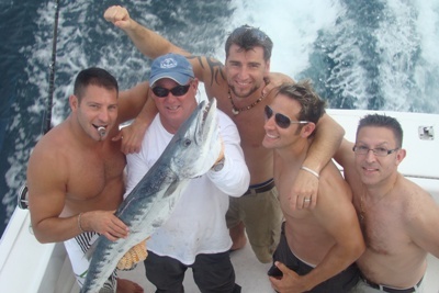 Once again we started out trolling the reef with 3 baits skipping across the surface and 2 baits running deep on planner board. And once again the bonitos were biting. Everyone was catching fish at will and after we had all had just about enough of catching bonitos we tried keeping one alive and slow trolling him over a ship wreck. Sure enough they just can't resist it and BAM a monster barracuda jumped on the bait and we were Hooked Up. Dan jumped in the chair and the fight was on. It was a back and forth tug a war for a good 10 min but finally once the fish got within J.J. gaffing range he never had a chance.