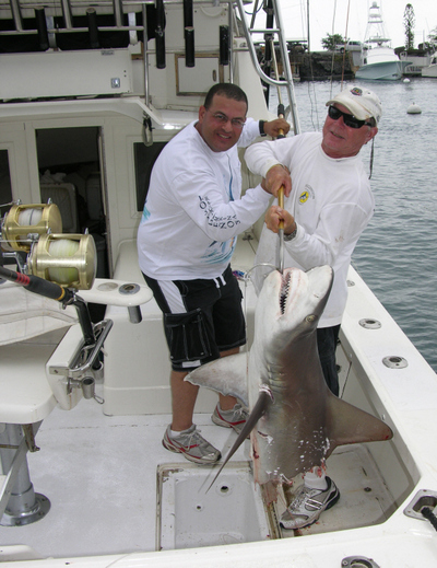 Mark and Sharon De Monaco from Sayreville, New Jersey had a full day charter on HighNoon last week. Mark and Sharon have big game fished all over the world, but Kona gave them quite an unusual experience. First, we landed a nice 35 lb Wahoo. Then we caught a 6 lb. skipjack tuna and rigged it up as live bait for a marlin. After a few hours of no luck with the live bait, I switched over to lure fishing. While I was watching the short corner lure, a huge Blue Marlin started folllowing the lure. I shouted to Mark, 'short corner, short corner!~!!". The Marlin grabbed the lure and screamed out about 400 yards of line. After a 10 minute fight, the fish just came off. End of day? Not at all. Just outside the harbor, I dropped down our live bait and it was immediately inhaled by a 200 lb. Sand Bar Shark. After about a 10 minute fight, suddenly the line began screaming off the reel. Mark hung on for dear life as the line just kept peeling off the reel. All of a sudden, the pressure on the reel lightened up, and Mark brought the shark to the boat. We were all shocked to see only the head and shoulders left of the shark. A huge Tiger Shark estimated at over a 1000 lbs had grabbed the shark we were fighting and with one incredible bite, cut that shark in half!!! Check out this photo: