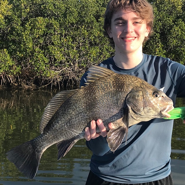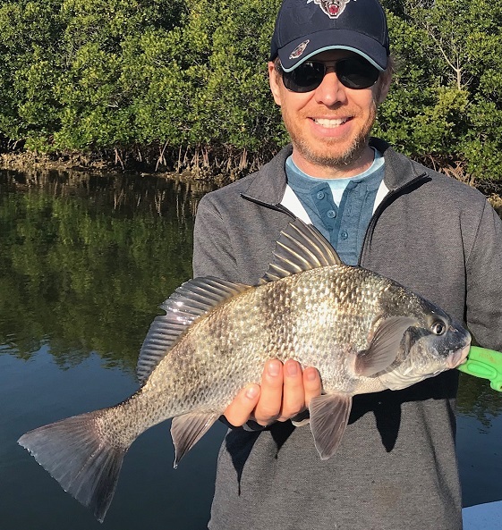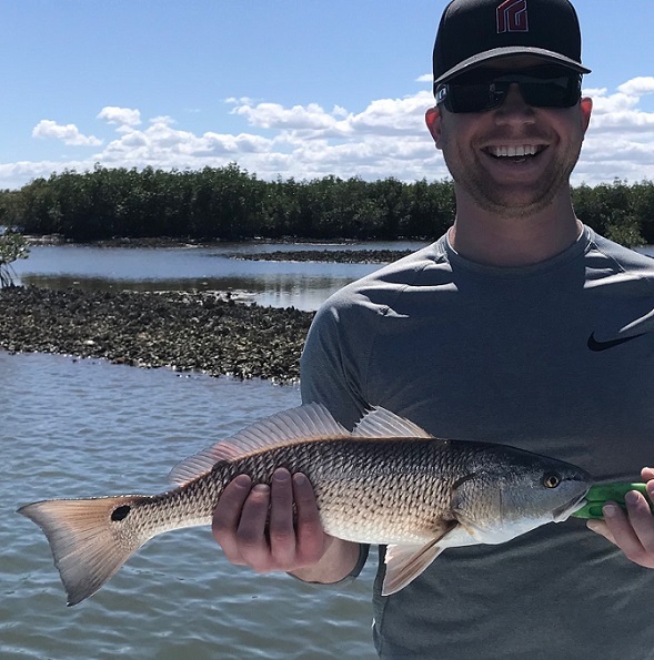 Our lagoon Redfish numbers are down from what there used to be, but we still catch some fun size ones in the back waters, Zak from Ohio with a fun size Red Drum ……………..