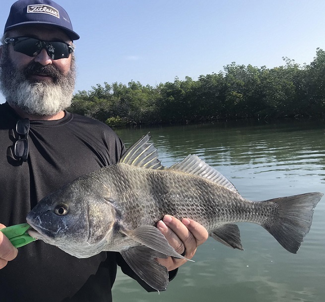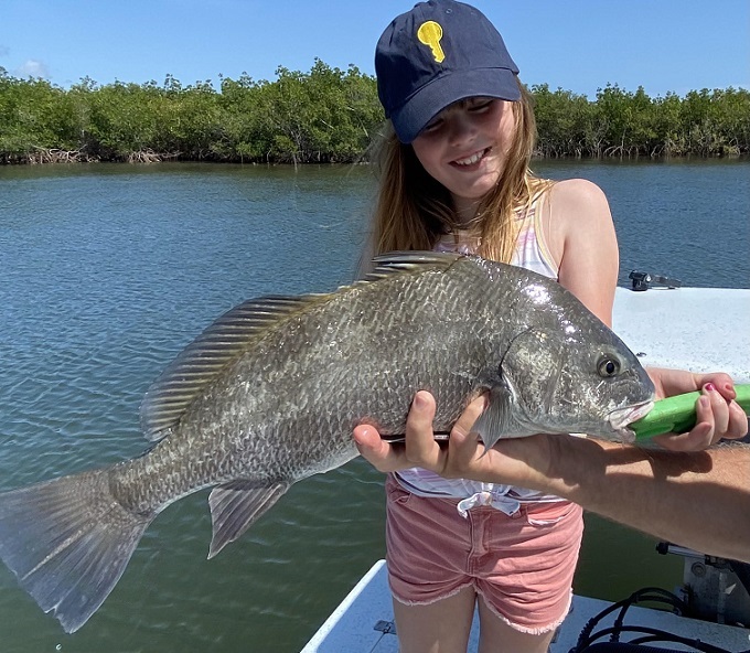 Summer 2023 has arrived to the waters here at New Smyrna and Daytona Beach and Mosquito Lagoon, time for early starts again for fishing trips, warm water, lots of schools of baitfish throughout the Intracoastal Waterway, summer vacation begins, kids out of school, lots of fishing trips with families and children, all of these summertime changes are here. Most fish are more scattered out here in the backwaters, drifting along channels and along drop offs as fish can be all along the way in the spread out pattern. Some fish in the upper water levels like Seatrout, Jack Crevalle, Ladyfish, others along the bottom and close to structure like Black Drum, Mangrove Snapper, Snook, Redfish, Whiting and others. Jim from Connecticut out recently with a really nice backwaters Black Drum we caught, photo and released …………..