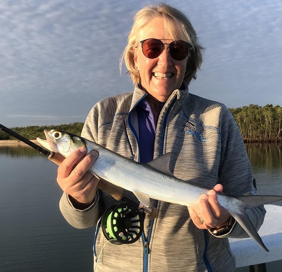 Repeat client Kristin from Alaska loves to fly fish, Ladyfish are one of the fun inshore game fish will take a fly, then a fast, jumping fight …………...