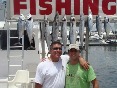 We started out trolling the reef with two lines down deep and three on the surface. Since we only had two anglers we had our limit of kings in no time and the bonitos just kept coming. It got to be pretty routine catching kings and bonitos but then we got a bite that was pulling a bit harder than the others. Dale jumped in the chair and ended up catching and releasing a big barracuda.