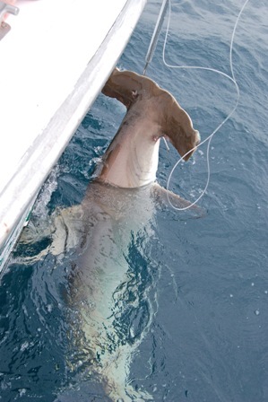 After a good 35 min of fighting and changing anglers they finally got this monster hammer head shark to the boat. We got all three hooks out of the shark got a quick measurement in order to have a replica mount made of their catch and watched him swam away in good shape