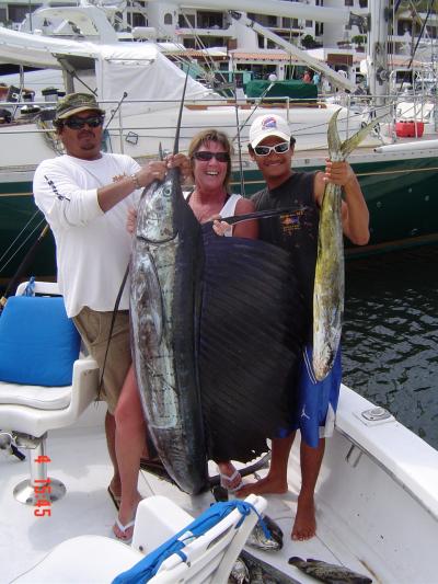 The areas north of Punta Mita are alive with large Sailfish, and beautiful Dorado or Mahi Mahi in the 40 plus inch range. Snappers are turning the sea red as they feed on surface bait. Rooster fish are in the area as well, even though the Summer Rains haven't started yet (they feed on debris in the water from the rivers, etc.). It looks like we'll have another great season with the Rooster fish this year, the true "Chicken of the Sea". But the story this week, in-shore was Sailfish 2 to 3 miles out, that's all! There were more bills out there this week than in the Postman's Mail Bag just after Xmas! An 8 hr trip can be stretched out to boat these beauties and still make it north of Punta De Mita. So what are you waiting for??