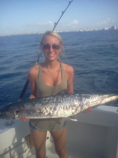 I trolled from one artificial wreck to another while the family took turns catching fish. One of the plainer rods got a strike and Julie jumped into the chair to bring the fish in. In 35 years fishing, this catch was the first for me – on the double hook bait on the same rod were two Bonitos, one on each hook, to my amazement!!!! We continued fishing and ended up with a total of 8 Bonitos and 5 Kingfish, one of which weighed 24 lbs – an Anaconda Kingfish, with Ashley as the angler.