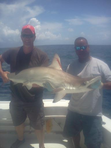 Greg wanted to do some Shark fishing so we switched over to accommodate him. We put out one surface Shark bait, one midrange Shark bait and one bottom Shark bait. Not to long afterwards we were hooked on the midrange Shark bait as Ashley jumped into the fighting chair to do battle with the Shark assisted by her father, Greg; they caught a 6 ft. Dusky Shark, which was released. We set up again for Shark fishing and this time the surface rod Shark bait hooked up. Greg jumped into the fighting chair and brought in a 6 ft. Golden Hammerhead Shark. Pictures were taken and the Shark was released to fight again.