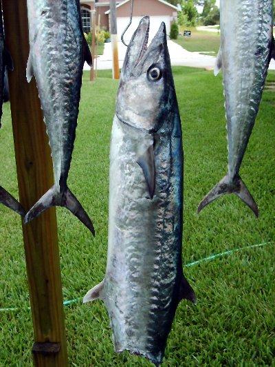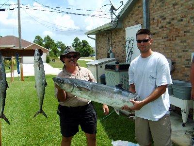 We setup for the first drift past a seventy foot reef with not much happening with the exception of a few cut offs.Then we decided to move south and setup on a color change thats was about 10 miles north of the St. Lucie Inlet. We the new adjustment to our position, we hooked up with two king mackerals in the ten pound range. After a short break we moved further south pretty much staight the St. Lucie Inlet. After retying from another cut-off, my Penn 7500 took off with a run of line that can never be forgotten! After losing about three quarters of the spool, I decided to chase the fish with the boat. After about a twenty five minute battle, I saw down about 30 feet a 5-6 foot shimmering fish.I yelled to the mate,"Get the Gaff it's a big one!". After another short run, the giant was being attacked by a bigger fish, about a 6-7 foot Shark. After losing about 3 feet of the magnificant King fish it weighed in about 40 pounds of what was 3/4 of a fish. I estimate the King to be in the 50 pounder possibly 60 pound range!! As I always say a half of loaf of bread is better than nothing! In this case a half of fish or better is better than nothing!! As luck would have it by having about three feet of my King cut off I was able to fit the remainder of the fish in my 49 gallon fish box! For now, I'm Capt Sal from St. Lucie Sportfishing Charters, stay safe & fish well!