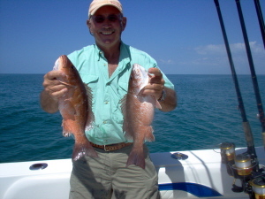 The photo shown is of angler, Jerry Casey, with a pair of mangrove snapper, 17 inches and 18 inches, two of several caught on shrimp on a recent offshore trip.