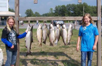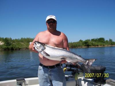 The fights have been spectacular! We're fishing 150'-200' straight off the Salmon River. Our spoon program has worked well off the downriggers run down 75-90'. The dodger/flies have been working off the dipsy & cooper rods very nicely.