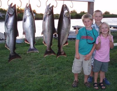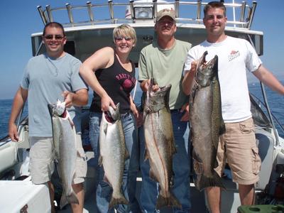 King salmon are moving closer and closer towards the Salmon River. Lake Ontario charters have been producing decent catches on most trips. There's even a few salmon starting up the Salmon River each day. On the last few charters out on the lake we've been fishing 50-60' straight off the river mouth. Salmon have been biting glow spoons, J-plugs and spin dr/flies down 10-20' off the bottom.