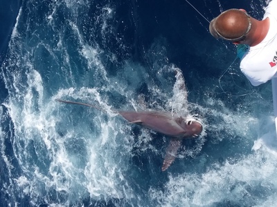 With little to no time left in the trip, the dead bait we had put out close to the bottom got hit, and the rod bent over so hard it almost touched the water line. We were hooked up to a real nice Shark. The Shark ripped off a ton of line as he headed offshore. We hooked up the Shark in 350 feet of water, and after an hour fight, it took us out to 500 feet of water. All the guys in the group took turns fighting this Shark until we got him to the side of the boat. The Shark turned out to be a 10 ft. Big Eye Thresher. Pictures were taken and the Shark was released.