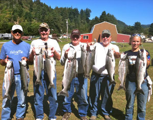 The last week's fishing has been entirely on the Klamath River, and fishing there has been excellent, with almost-daily limits of chrome-bright hard-fighting salmon fresh out of the ocean. These salmon are fast! Kevin has had a great streak of salmon limits going for 33 days in a row, but on 9-21-11, the fish were on the hook in the morning but were getting off, then the wind came up in the afternoon and shut the bite down. The opportunities were there, but just not landed. It just goes to prove that when the fishing is good is the time to get fish in the boat!