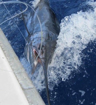 One marlin came right up to the boat chasing the bait that we were trying to keep away from the porpoise. He took the bait right at the boat. A lit up blue marlin at the back of the boat is quite a sight. Joe dropped back and set the hook. After a short battle, Joe managed to catch a blue marlin that was between 200 and 250 lbs. I wired the billfish, took some photos, and released the lit up fish back to the ocean.