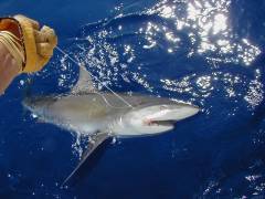 Sharks, sharks and more sharks! I'm one of only a few boats here that regularly targets sharks and I catch more than anyone here. They have been thick around the FAD's and ledges and put on a real good fight. Boats that have been live baiting for marlin around the FAD's are hooking sharks whether they like it or not. Most of the charter boats around here are trying NOT to hook them. In fact, if you don't use a cable trace or wire you probably won't get it all the way to the boat anyway. Shark teeth slice through monofilament line pretty easy. I've been taking the opposite approach by rigging for sharks with a cable trace and a circle hook knowing that the likelihood of hooking a shark is much higher than hooking a marlin. If a marlin takes the bait, fine. I had that happen recently but pulled hook on the marlin. You may not get the spectacular jumps from a shark (except a mako) like you do from a marlin but pound for pound fighting, sharks are just as tough a fight. At the boat, you can usually get the hook out of a marlin but I don't even attempt that with the sharks. I cut the cable as close as I can (dare) and leave them with a fashionable lip ring to show all their shark buddies.