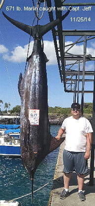 Kona is the blue marlin capitol of the world and one of the reasons for that is that blue marlin are caught here every month of the year. Most other locations are seasonal. Kona is also well known for "Grander" blue marlin, weighing 1000 pounds or more. I mentioned in a previous report that March is the month with the most granders caught but we had just one particular month of the year that had never produced a grander. Take a guess what month and why I'm mentioning it now….. Thanks to Bomboy Llanes we now have the matching set of all 12 months. Bomboy weighed in a 1041.5 pounder on the 19th after an 8 hour battle. While I'm sure that there have been several granders hooked up in the month of November over the past several years, most of the big marlin win the fight. Any "Beast" status marlin, 500+ lbs. has a lot of power and will test the strength of any weak point in your gear or any weak point in an angler. Tired anglers will let the line go slack during a fight and that's when the fish has a chance to shake the hook out. One more interesting thing about Bomboy's catch, to me anyway, is the boat he was using. Kona boats usually stay in Kona and when they get a new owner, they get a face lift, maybe new power and many times, a new name. One of the fun things for us old timer captains to do is point to boats and see who remembers the history of what it was named before. The boat Bomboy caught the grander on is the "Lanakila". My dad moved to Kona in 1984 and bought that same boat with the name "Roy's Toy" on it. Dad took the old Crysler 440 gas engines out and turned it into a twin diesel with the new name "Puka Kai". Dad thought it would be funny to name the boat "Hole" (puka) in the "water" (kai). For you boat owners, you're most likely familiar with this term for a boat but it turned out to be a big mistake marketing wise. Most vacationers don't know how to pronounce Hawaiian and although puka is pronounced 'poo-kah', many people thought it was 'puke-a'. Not a good name. Especially if someone has that memory of being violently sea sick during a fishing trip. I ran dad's boat for several years and I know that the name definitely cost us business. So what does this have to do with fish? Nothing at all! But, when it comes to naming your boat, go to the internet and do a search because there's some really good names out there. Some of the names you see on boats are just awful!