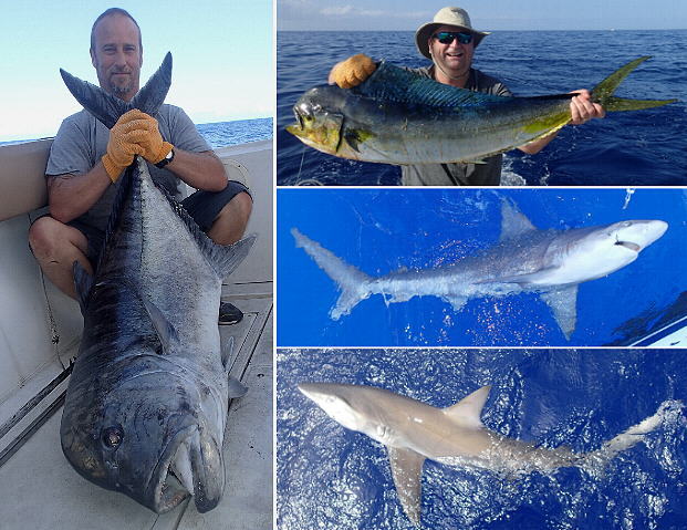 I knew it was only a matter of time before some Karen was going to complain about me catching sharks because of the new law that went into effect at the beginning of the year. Fisheries law enforcement got a complaint about me flying a shark flag (and a flag that I released it). I don't need to fly the flags but I choose to do so because I always have and, 'I'm not breaking the law'. There was a time when I very rarely encountered sharks while bottom fishing and my catches were amberjack, almaco jack, giant trevally, and occasionally a shark or a snapper. Those same fishing grounds had no fewer than half a dozen and as many as fifty boats bottom fishing every day! That came to an abrupt halt a little over a decade ago when many hundreds of Galapagos sharks moved in and destroyed that fishery. Then came the sandbar sharks. Today, sometimes there are sharks around, and sometimes not. I'd rather be catching huge GT's like the one in the photo or other big jacks but when you go to the bottom, you never know what's going to bite.