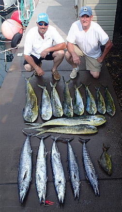 The mahi mahi have started moving in as is typical for this time of year and the tuna bite on the buoys and ledges has been pretty good too. There's obviously been a new hatch of both mahi mahi and tunas because on the few charters I have had this month, I've been picking up some real small babies of both. I've seen a few spearfish flags hanging in the harbor and I usually do pretty good with those because I pull small lures on stand-up tackle out in the deep. I guess I've just been able to steer around them. Recently I caught some ono out in the deep but from what I hear from other fishermen, the near shore ono bite is still real slow. It's the end of their season anyway but one thing about ono, we can have a good run any month of the year.