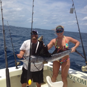 As Joe was putting out the lines our first strike came right away. The bride to be, Chelsea, was given the first fish and it turned out to be quite a fish! Her first Sailfish was on the line and jumping! Because only a few baits had been put out we had little to retrieve and were backing down quickly as Chelsea took in the line. And within 15 minutes, we were able to get a picture of Chelsea and her prize.