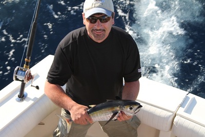 Today, JJ and Mike had a four hour charter in the afternoon. On the way out the inlet they bought some live goggleyes from the bait boat, hoping to catch the big ones. The wind has been out of the south and southeast around 15-25 mph for the last 6 days which makes the fishing excellent. They started trolling for the first two hours of the trip and the bite was really on. They caught plenty of bonitos, a few kingfish and two nice blackfin tunas.
