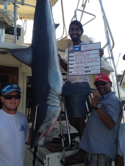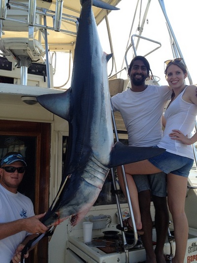 This afternoon Mike, Darin, and Arvin went shark fishing off of Fort Lauderdale beach. They ran out to three hundred and fifty feet of water, loaded up with nice fresh bonitos, caught on the way out the inlet. They were ready for a sea monster, with rods set up with 2 hook rigs, using #19 wire and 400 lb leader. After a good hour of waiting, the mid bait got hit, but the fish missed the bait. With a little patience they were confident the fish would come back, and sure enough, he came back and he was on. Darin gunned the boat to set the hook good and this huge Mako shark came jumping out of the water into the air. Too bad they didn't have a camera ready because it was a cool site to see! The crew finally boated the monster 250 lb. Mako. It was a great fight, and now it's some good eating.