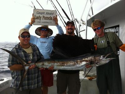 I usually run the Lady Pamela IV, operating the boat from the flybridge, but today, I was aboard the Lady Pamela I and worked the cockpit, while Keith ran the boat. We fished with Glenda and her husband on a six-hour, 10am4pm charter, and we needed to catch Glenda a fish. We picked a few live baits up at the local Lauderdale Marina on the way out, and went trolling for the first two hours. I was confident that we would catch something cool today because the last 4 days of fishing had been slow, and I knew that a recent cold front that had moved through was going to bring the fish bite with it. We landed a couple of nice kingfish on the troll then decided to switch things up a little and go kite fishng. I cannot say enough about witnertime kite fishing as we can catch wahoo, mahi-mahi, sailfish, marlin, kingfish, and tuna. Our first set of the kites today was just specatcular. We were still setting out our first four baits when we hooked a monster sailfish. It was a 30 minute battle before finally bringing it to the boat. What a great catch! We put the baits right back out and hooked another one, but it wasn't long before it pulled the hooks. We freshend up the baits again and sat right in the same spot until close to the end of the trip. I was right in the middle of telling Glenda about times when you might never get a bite until you are reeling in the last baits, which we happened to be doing, when darned if we didn't hook up! We tied into another sailfish that we ended up catching and releasing just before heading home. Glenda said they have fished all over the world and this was their best trip ever. For me, it was just a great day to be in the cockpit with some fine anglers.