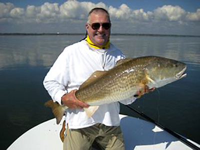 Friday Dr. George Yarko joined me for some Mosquito Lagoon fishing. Of course I went straight to the big fish spot. I didn't pole five minutes before a tail popped out of the water. George made one cast with a dead shrimp and hooked a red of about 15 pounds. Nice fish for the first cast!