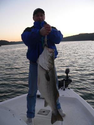STRIPERS The is is GOOD for big fish. Where not catching a lot of fish right now. But what we are catching are MONSTERS...I had a really good month for big fish. 8 fish this month over 25 pounds with 4 of them being over 30 pounds... The southend of the lake is by far the best place to be right now....The shad kill as stop due to the water warming up. So these fish are back eating BIG BAIT again... Flat-lines and Planner Boards are working the best right now... Iron Hill is loaded with bait and fish. The only draw back to fishing there is all the boats.. But it is still worth fishing...I have also caught some really good fish. Off of main lake points north of the dam...The fish on the main lake seems to be hitting the u-rig better then live bait.... The fish picture below was caught on Feb 28 2007 By Jim Taneri while fishing with his brother Denis. On a guided trip with First Bite Guide Service. www.firstbiteguideservice.com