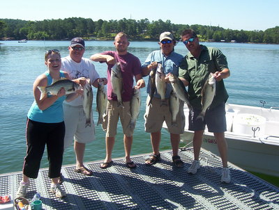 Line side fishing is great this week for numbers and we have been catching most of our fish on down lines. "Just last week, I had two boats working and boated 84 fish in a half day between the two of us. The hybrids we caught this week where deep. And I mean real deep and they are 42 to 50 feet deep. We have not seen fish this deep on Allatoona in June. They are deep like they are on Lanier. The low levels last year changed the dynamics of the lake. Usually they're 18 to 24 feet deep. If you see them deep, go get them. Most of the fish are in the mid-lake section to the south, from Galt's Ferry to the 75 bridge, and I have been catching a lot of fish within sight of the dam. The mouth of Stamp Creek has been good, Coopers Branch is good at sunup, the Allatoona Creek arm and Tanyard Creek are good. You can flat line at sunup, but you're better off throwing a Sammy and a Fluke because it's only a 15-minute window to catch them on top, then it's time for down rods. After the sun gets up good, go to U-rig from right in front of the dam to Stamp Creek. The key is a loaded Mack Farr U-rig with nine ½ ounce jigs. We're dragging the umbrella rigs and catching six to 12 doing that to wrap up my trips. For lots of action for small white bass, go to the Harbortown Marina area in the evenings and throw a Rooster Tail. I still have some days open for July. I even have July 4 open as of right now. Call me and let's take the kids fishing. 770 827-6282