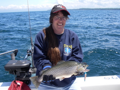 The salmon are here one day and gone the next, which is typical for this time of year. Work the deeper water, 130 to 300 feet. find the cold temperature, 40 to 50 degrees and concentrate your spread there. Troll flashers with atomic flies at 2.3 to 3.0 mph. NK magnum spoons in Black green glow have been taking some nice fish as well.